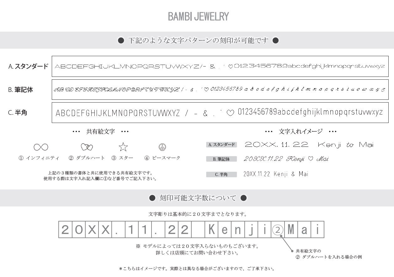 プチマリエ・ハニーブライドの結婚指輪の内面に刻印できる文字のサンプルです。